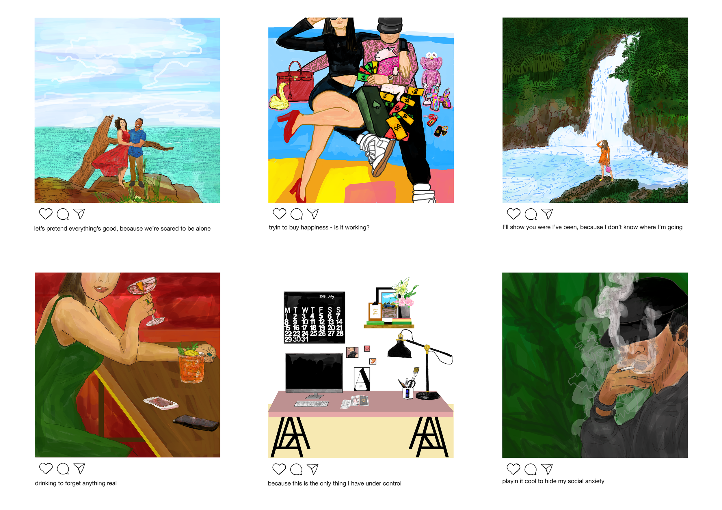 Instagram vs. Reality is a commonly seen online meme which reflects our usage of social media to show our best selves rather than the truth. The use of wordplay in the Chinese title of 照骗 (zhàopiàn), by swapping the original 片(piàn) for 骗(piàn - meaning fake) refers to the act of producing a fake image or lifestyle just for the internet and the English title of Finsta refers to people’s “fake instagrams” or fake accounts where ironically they can truly be themselves.